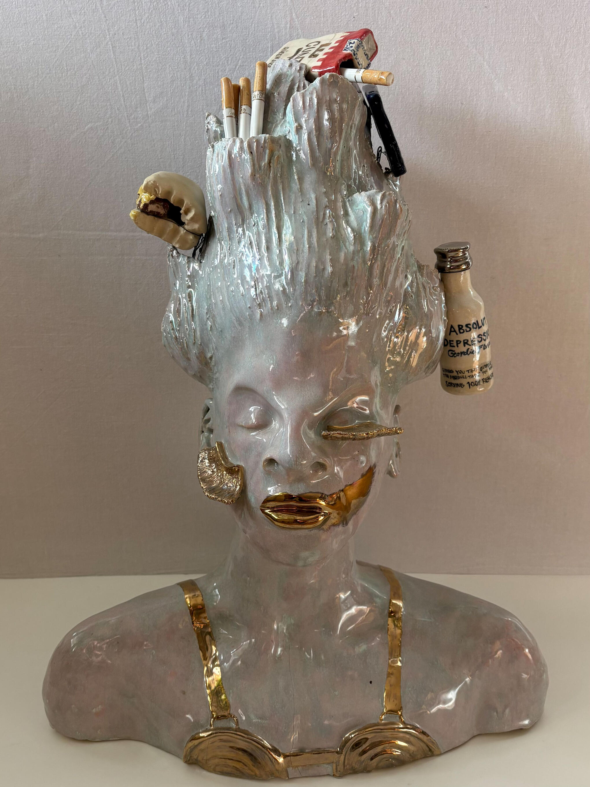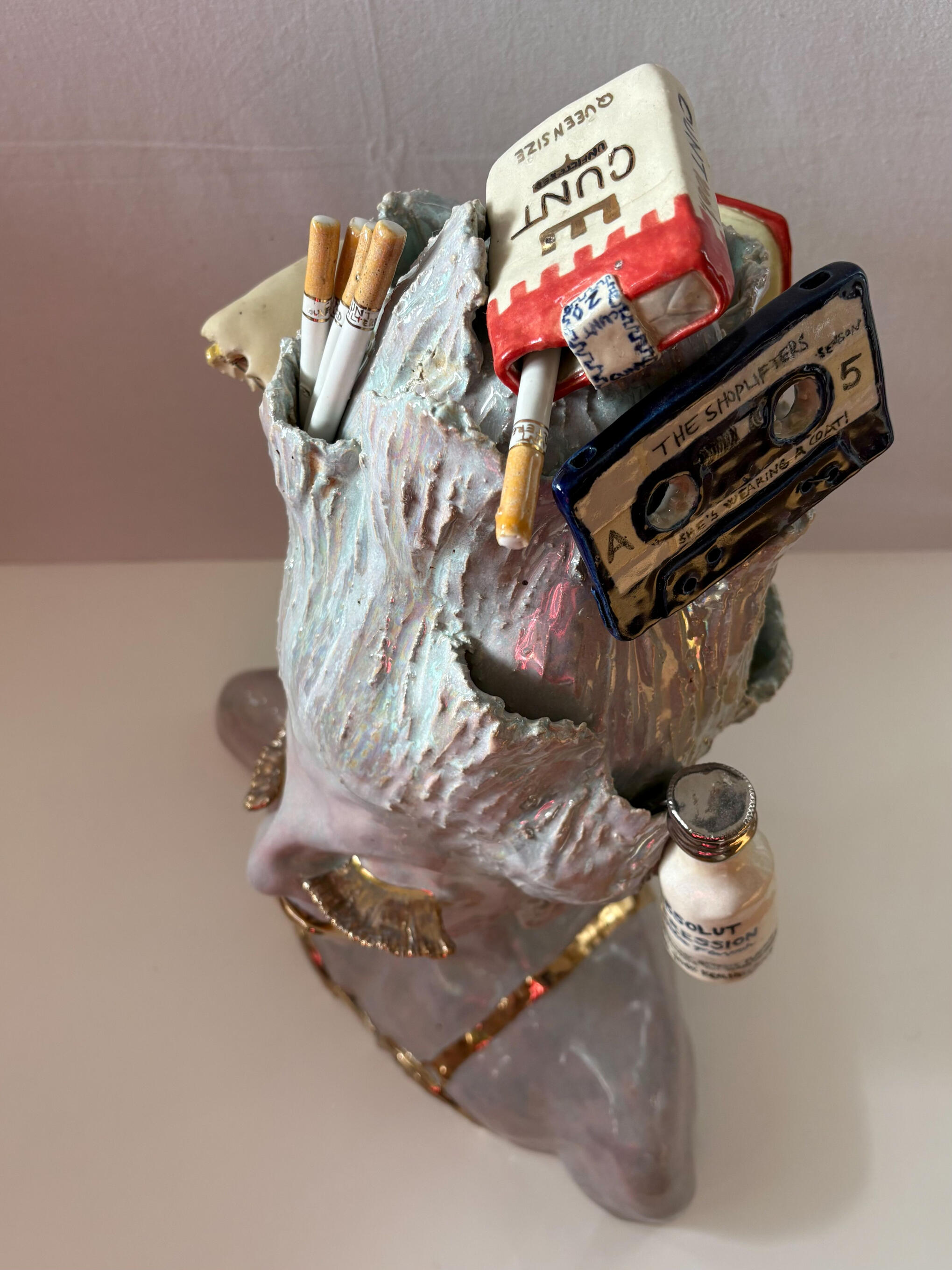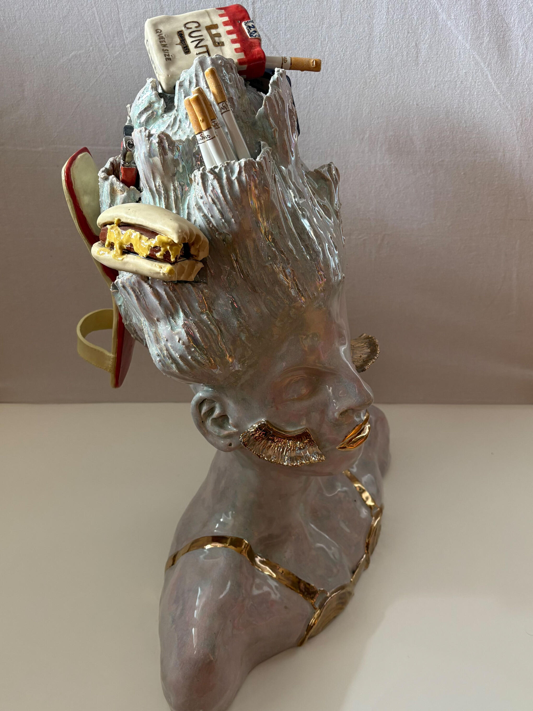 Heidi Järvinen is a Finnish visual artist working primarily with ceramics, alongside textile and mixed media.Her work often begins from familiar, everyday objects - food, packaging and decorative items - that shift away from use and towards something excessive, humorous and slightly unsettling. Trough repetition, exaggeration and material choices, these object lose their original function and become something else: things that exists only to be looked at.Järvinen is interested in the moment where the ordinary turns strange, and in questioning what makes an object meaningful, desirable or unnecessary. Her works embrace excess - at times slightly embarrassing, yet also tender and playful. They revolve around desire and other deeply human things exploring consumption, material culture and the boundaries between product and artwork.